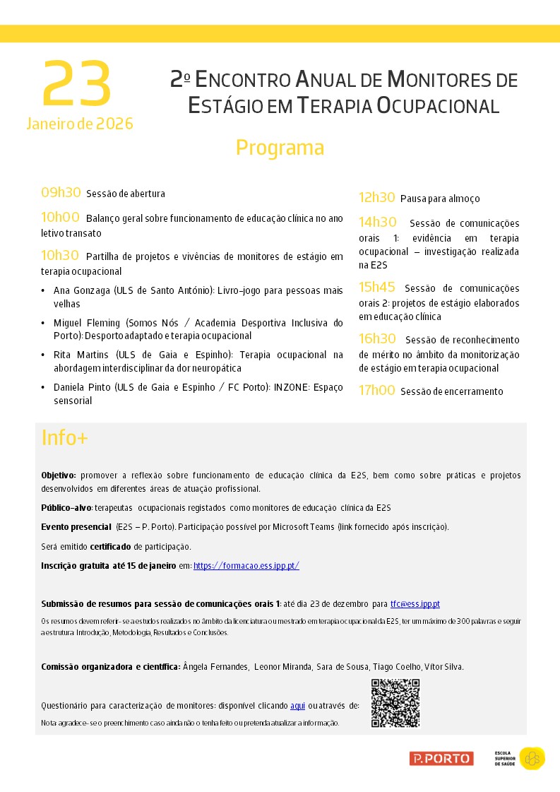 09h30 Sessão de abertura 10h00 Balanço geral sobre funcionamento de educação clínica no ano letivo transato 10h30 Partilha de projetos e vivências de monitores de estágio em terapia ocupacional - Ana Gonzaga (ULS de Santo António): Livro-jogo para pessoas mais velhas - Miguel Fleming (Somos Nós / Academia Desportiva Inclusiva do Porto): Desporto adaptado e terapia ocupacional - Rita Martins (ULS de Gaia e Espinho): Terapia ocupacional na abordagem interdisciplinar da dor neuropática - Daniela Pinto (ULS de Gaia e Espinho / FC Porto): INZONE: Espaço sensorial 12h30 Pausa para almoço 14h30 Sessão de comunicações orais 1: evidência em terapia ocupacional – investigação realizada na E2S 15h45 Sessão de comunicações orais 2: projetos de estágio elaborados em educação clínica 16h30 Sessão de reconhecimento de mérito no âmbito da monitorização de estágio em terapia ocupacional 17h00 Sessão de encerramento Evento presencial (E2S – P. Porto). Participação possível por Microsoft Teams (link fornecido após inscrição). Será emitido certificado de participação. Submissão de resumos para sessão de comunicações orais 1: até dia 23 de dezembro para tfc@ess.ipp.pt Os resumos devem referir-se a estudos realizados no âmbito da licenciatura ou mestrado em terapia ocupacional da E2S, ter um máximo de 300 palavras e seguir a estrutura: Introdução, Metodologia, Resultados e Conclusões. Comissão organizadora e científica: Ângela Fernandes, Leonor Miranda, Sara de Sousa, Tiago Coelho, Vítor Silva. |