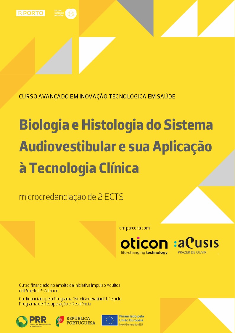 UC1_Biologia Celular e Histologia do sistema auditivo e vestibular 1.Caracterização histológica do sistema auditivo e vestibular: 1.1. Pavilhão auricular e canal auditivo externo 1.2. Ouvido médio 1.3. Ouvido interno 2. Caracterização, organização e função das células que compõe as diferentes estruturas do sistema audiovestibular 2.1 Células ciliadas 3. Interpretação de imagens de histologia do sistema auditivo e vestibular UC2_Técnicas e testes clínicos de análise do processamento de sinal do sistema auditivo e vestibular 1. Técnicas e testes clínicos de análise da fisiologia do sistema auditivo e vestibular 2. Integração da estrutura histológica em função do processamento de sinal nas diferentes partes do sistema auditivo e vestibular, periférico e central Microcredencial realizada no âmbito da iniciativa Impulso Adultos do Programa IP-Alliance, cofinanciado pelos fundos do programa «Next Generation EU» do Plano de Recuperação e Resiliência (PRR). Em parceria com OTICON e ACUSIS |